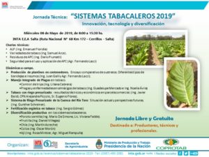 Los invitamos a participar como expositores en la “Jornada Técnica para Sistemas Tabacaleros 2019” organizada por el Instituto Nacional de Tecnología Agropecuaria (INTA) y la Cooperativa de Productores Tabacaleros de Salta (COPROTAB). La misma se realizará el día miércoles 08 de Mayo de 2019 de 9:00 a 15:00 hs, en el Campo Experimental de Tabaco de la Estación Experimental Agropecuaria Salta, ubicada en la Ruta Nacional Nº68, Km 172 – Cerrillos, Salta.